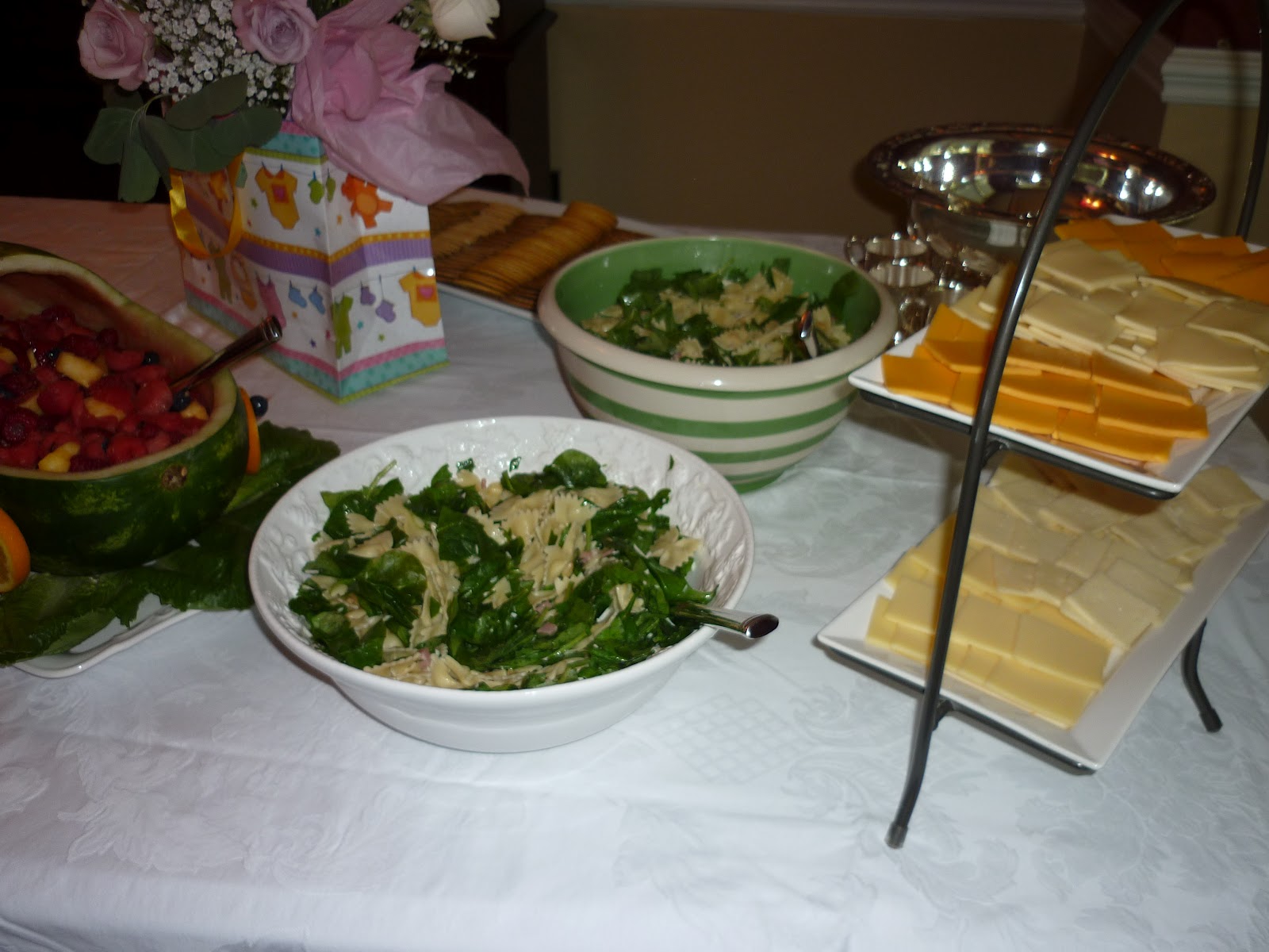 The shower started at noon, so a light lunch of chicken salad sandwiches, salads, cheeses, and fruits was served.